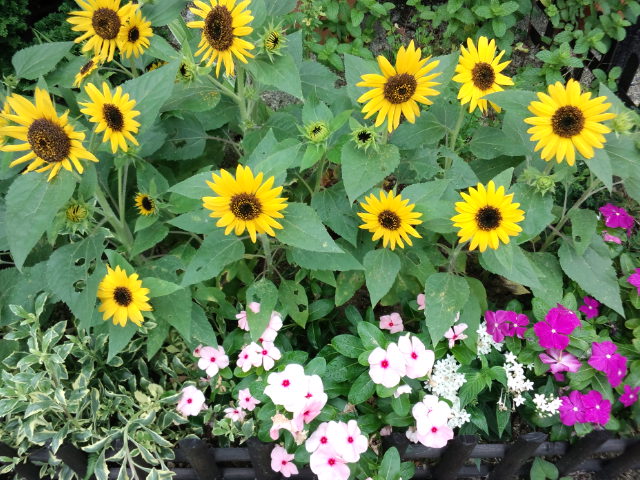 花壇のミニヒマワリがようやくほぼ満開になりました。